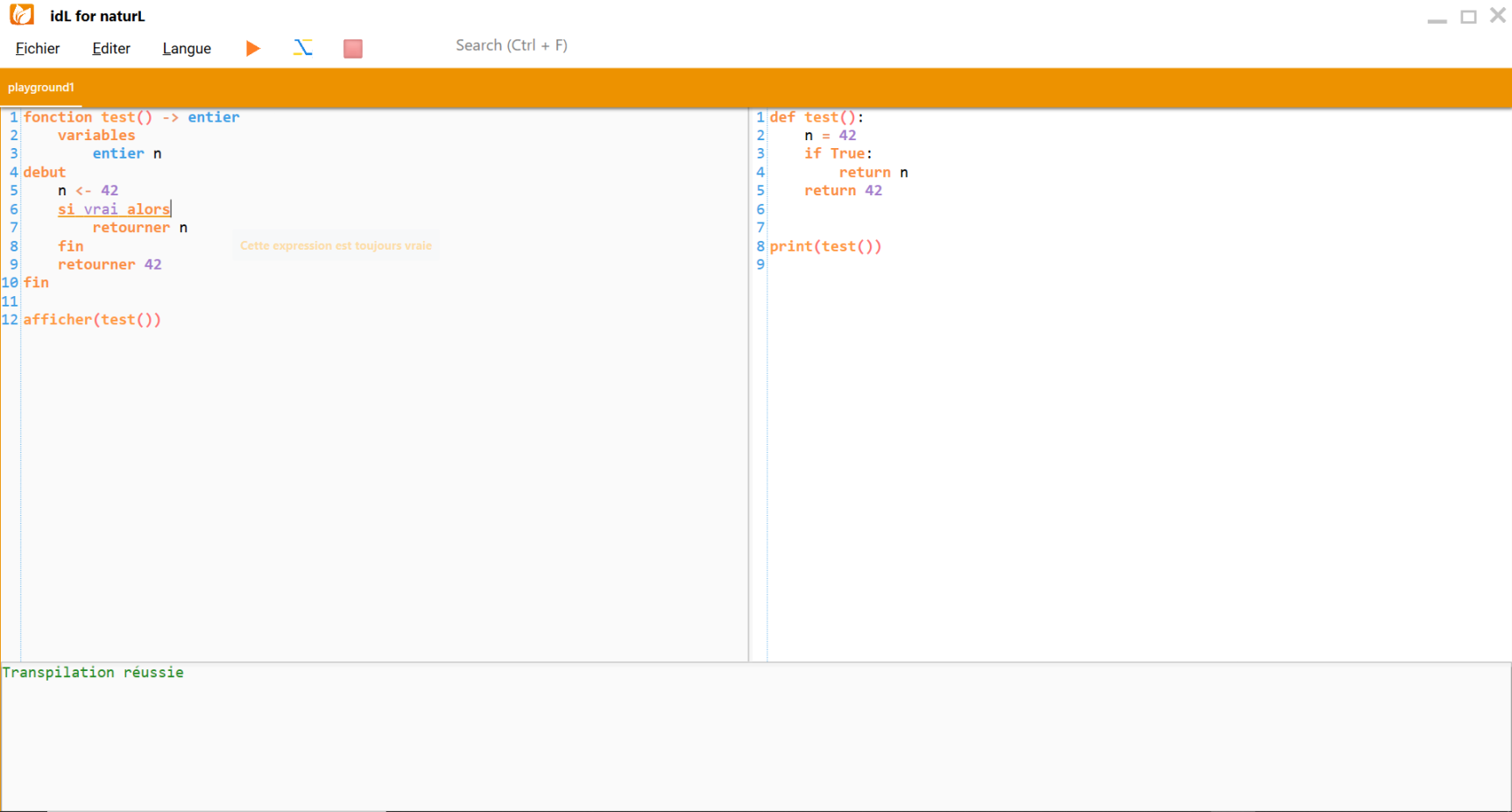 Avril 2020: Deuxième version de naturL/idL: transpilation de fonctions plus complexes manipulant des listes, système d'imports, simplification d'expressions, internationalisation, editeur développé, nouveau design, capable d'afficher des messages d'erreurs, de transpiler et d'interpreter le code transpilé.